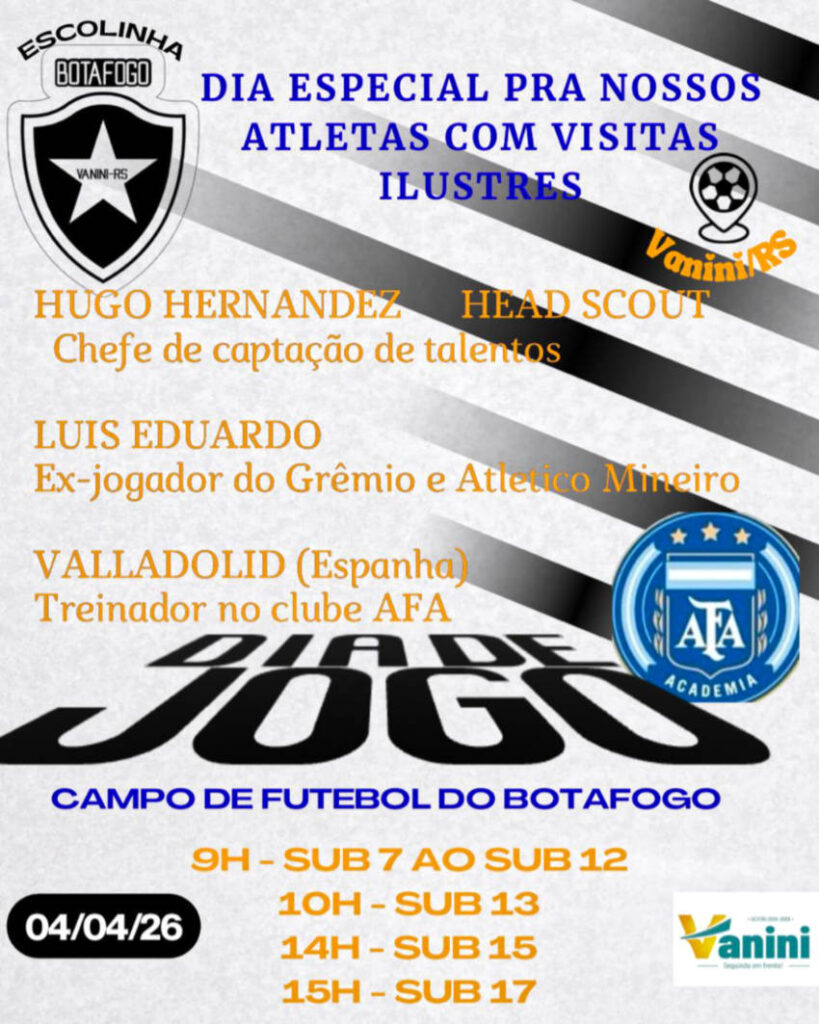 O Soledade FC realiza neste sábado (4), a partir das 9 horas, uma avaliação de jogadores no Campo Municipal de Vanini. A atividade integra o processo de captação de talentos do clube, ligado à Associação do Futebol Argentino (AFA).