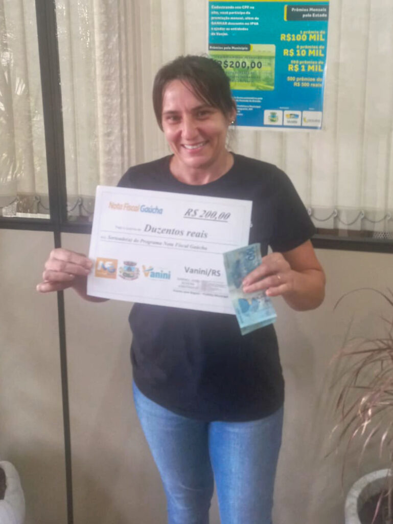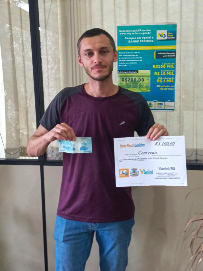 Os ganhadores do sorteio municipal de março do Programa Nota Fiscal Gaúcha (NFG) já receberam seus prêmios. Daniela Fanton Moras foi contemplada com R$ 200,00, enquanto Juliano Constantini recebeu R$ 100,00.