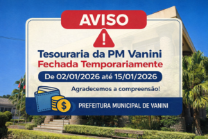 A Tesouraria da PM Vanini informa que estará temporariamente fechada para atendimento ao público, bem como para a realização de operações financeiras, no período de 02 de janeiro de 2026